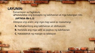 KONSEPTO AT KATANGIAN NG KABIHASNAN Maam Erenea January 2020 kahulugan ng kabihasnan at sibilisasyon kahulugan KABIHASNAN Kabihasnan - nagmula sa salitang bihasa o pagiging eksperto o kagalingan sa isang bagay. Nagmula sa salitang Latin na civitas. AP7KSA-IIb-13 Konsepto ng Kabihasnan at mga Katangian Nito Grade 7 Araling Panlipunan Kumusta mga mahal kong mag- aara.