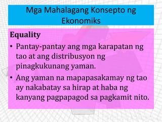 Thu Jun 24 2010. MAHALAGANG KONSEPTO NG EKONOMIKS Sa paksang ito ating aalamin ang mga importanteng konsepto ng ekonomiks at ang kahulugan nito. Dito natutukoy ang mahahalagang konsepto sa pag-aaral ng ekonomiks at kung paano nailalapat ang mahahalagang konsepto ng ekonomiks sa pang-araw-araw na pamumuhay ng mga tao.