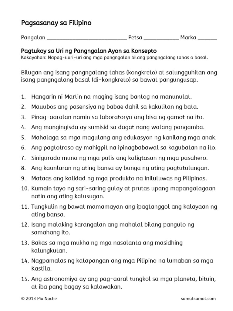 It also has a table with examples of these two types of nouns. Pagtukoy sa Uri ng Pangngalan Ayon sa Konsepto Mga Sagot Bilugan ang isang pangngalang tahas kongkreto at salungguhitan ang. Kung ang bawat mamamayan ay gagawa ng makakaya uunlad ang ating bansa.