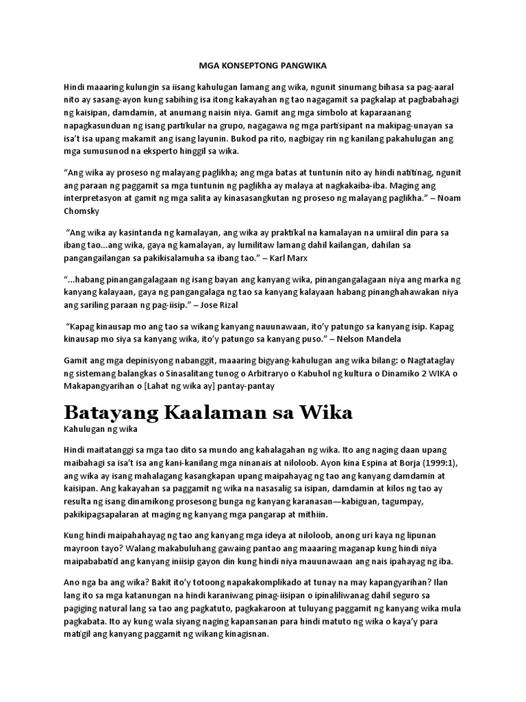 Ano ano ang mga konseptong pangwika brainly. Isa sa mga ito ay pagpapalakas ng resitensiya at pagkain ng masustansiyang pagkain gaya ng gulay prutas isda at karne. 0 ratings 0 found this document useful 0 votes 98 views 28 pages. Sa Saligang Batas ng 1978 ay pinagtibay ng Komisyong Konstitusyunal na binuo ni dating Pangulong Cory Aquino ang implementasyon sa paggamit ng Wikang Filipino.