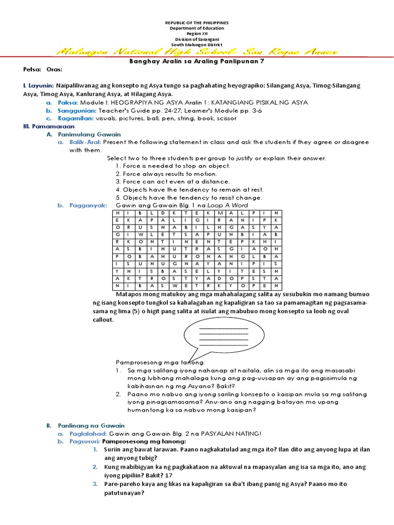 Loop A Word Ang gawaing ito ay susubok sa iyong kakayahang humanap ng mga salitang bubuo sa iyong kaisipan tungkol sa paksa at kung paano mo ito bibigyang kahulugan. Ang mga gulay na inani ay makakatulong sa tao para maging malusog. Naipapaliwanag ang konsepto ng Asya tungo sa paghahating heograpiko.