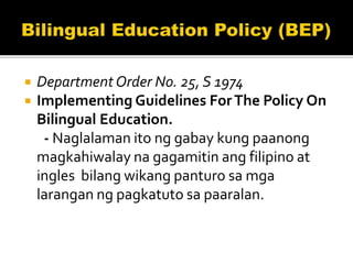 At tulad ng ibang bahagi ng daigdig ang wika ay mayroon ding mga katangian. - Samantalang linilinang dapat ay payabungin at payamanin pa salig sa umiiral na wika sa Pilipinas at iba pang mga wika. At hanggat walang ibang itinatadhana Ingles.