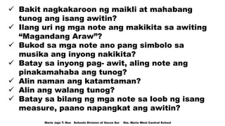 Pagkilala sa ibat ibang uri ng mga note at rest B. Dahil ito ang naririnig niya kapag siyay nagsusulat 10. Dahil ang tema ng kanyang mga isinulat ay tungkol sa sisiw c.