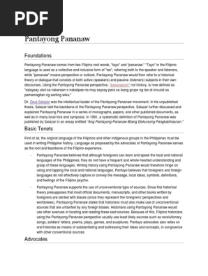 PP aims to give a preliminary overview of what may yet turn out to be one of the most influential and controversial trends in the history of the Philippine social sciences. 2 Dagdag pa ni Salazar magkakaroon lamang ng pantayong pananaw kapag. THE CONCEPT OF PANTAYONG PANANAW It is a programmatic discourse developed as a response to the westernized perspective of the study of Philippine history and historiography.
